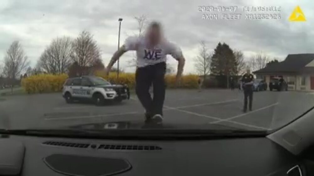 Deze knakker werd vanwege voor ons onbekende redenen aangehouden maar vond het nodig om er als een haas vandoor te gaan. Leuk idee natuurlijk, maar een politieauto als trampoline gebruiken gaat in de rechtszaal niet in je voordeel werken.