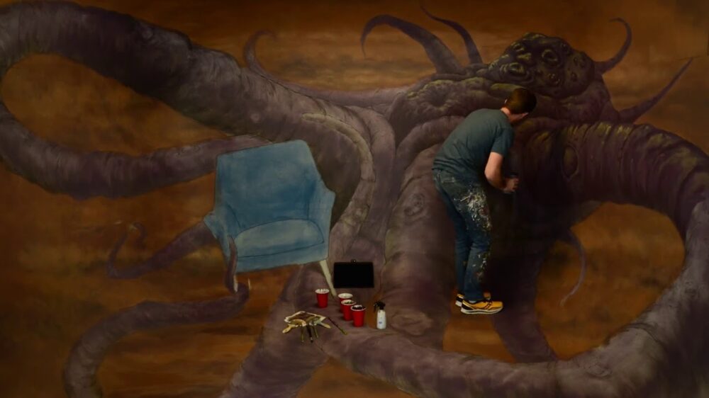 Creatieveling bouwt kamer met ronde wanden en maakt een vet 3D-schilderij