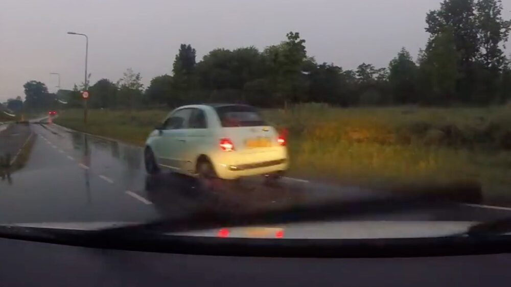 Trut in Fiat 500 van rechts geeft politieauto met zwaailicht geen voorrang