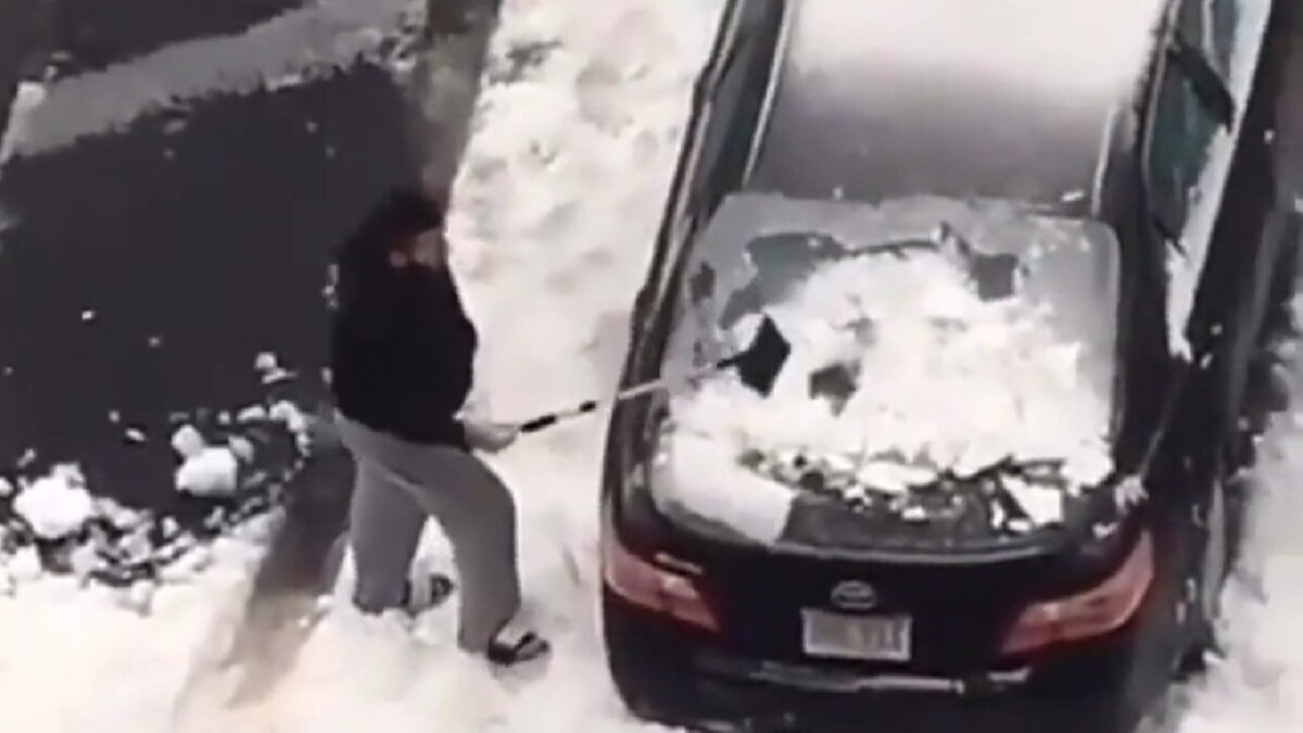 Idioot sloopt autoruit tijdens het weghakken van de sneeuw