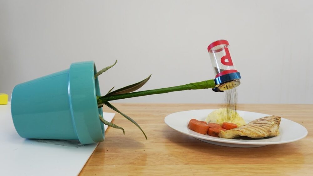 Het is ook lastig. Zit je net lekker even op gepaste afstand van elkaar te eten, wil je de peper hebben. Zelf pakken kan niet want afstand, en aangeven is natuurlijk ook maar een potentieel broeinest van bacillen doorgeven via handcontact. Gelukkig heeft onze Joseph de oplossing.