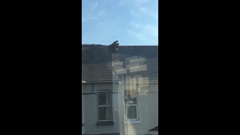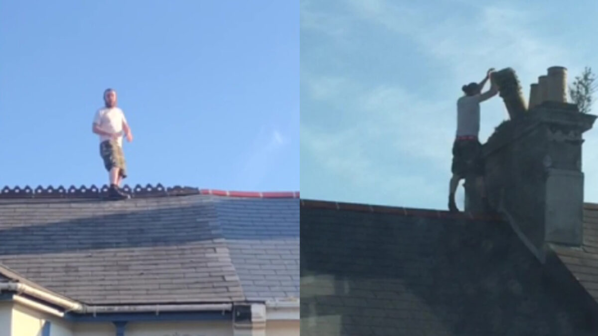 Gekkie zit 4 uur op dak en gooit schoorstenen op auto's