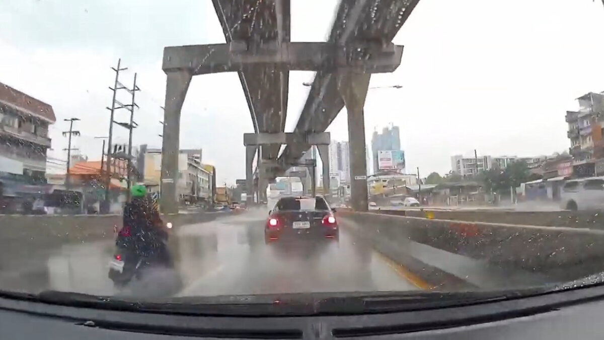 Aquaplanende motorrijder wordt nèt niet ondersteboven gereden door automobilist