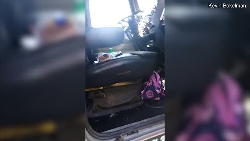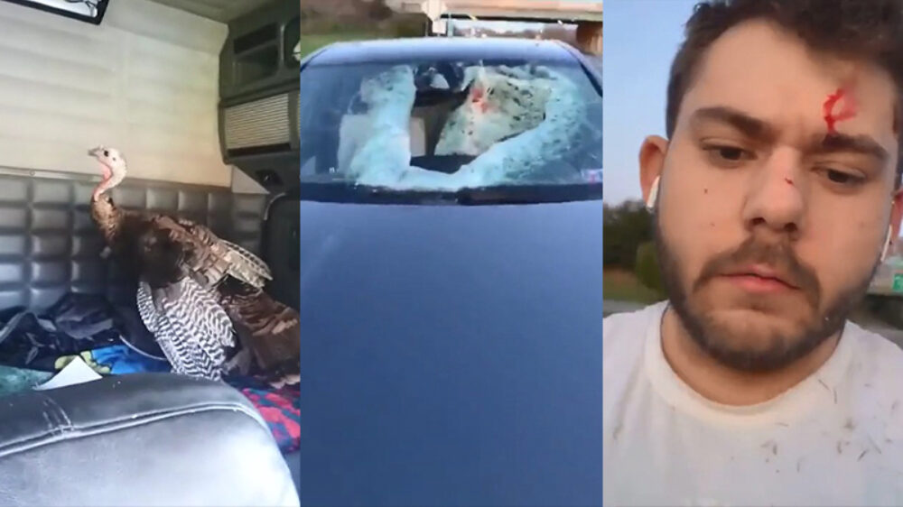 Vrachtwagenchauffeur stuurt kalkoen de weg op die dwars door voorruit vliegt