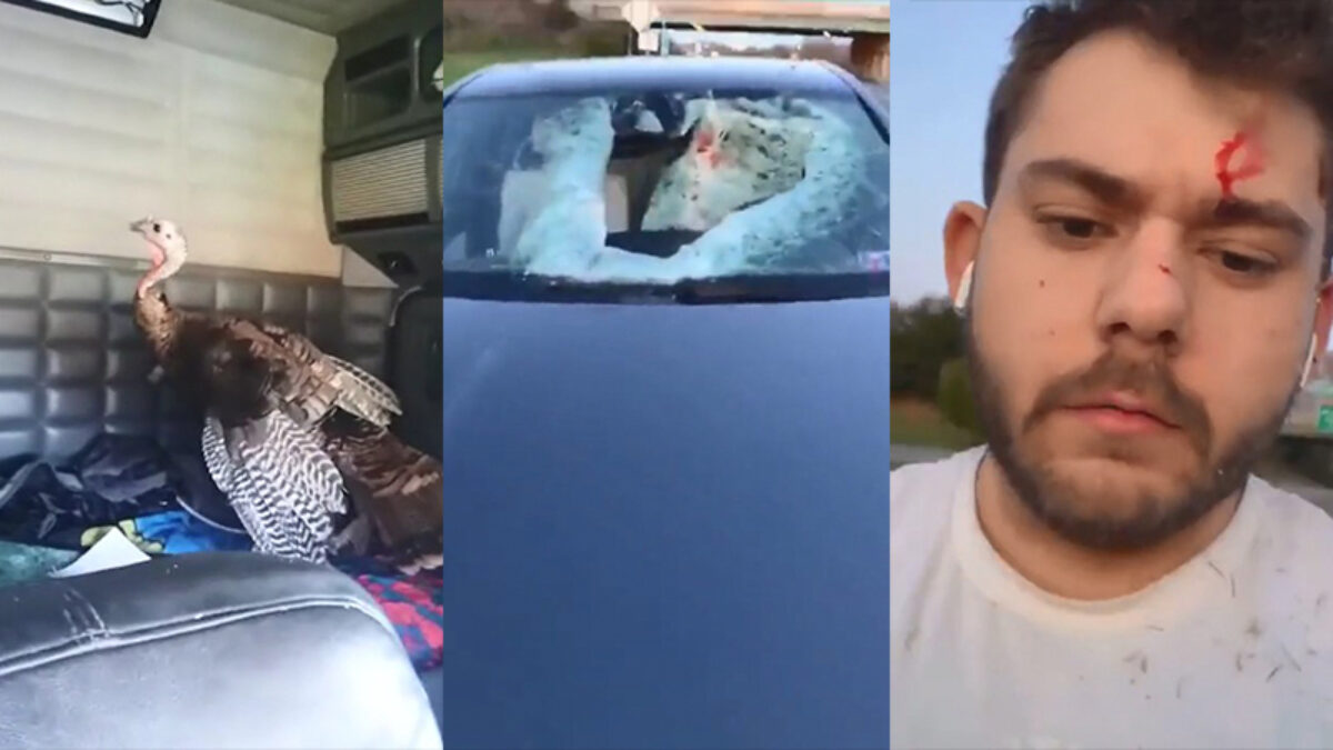 Vrachtwagenchauffeur stuurt kalkoen de weg op die dwars door voorruit vliegt