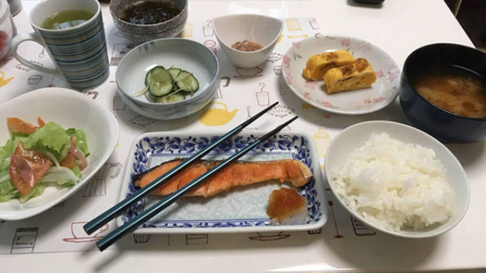 Gegrilde vis, rijst, misosoep, groenten, koffie of thee.