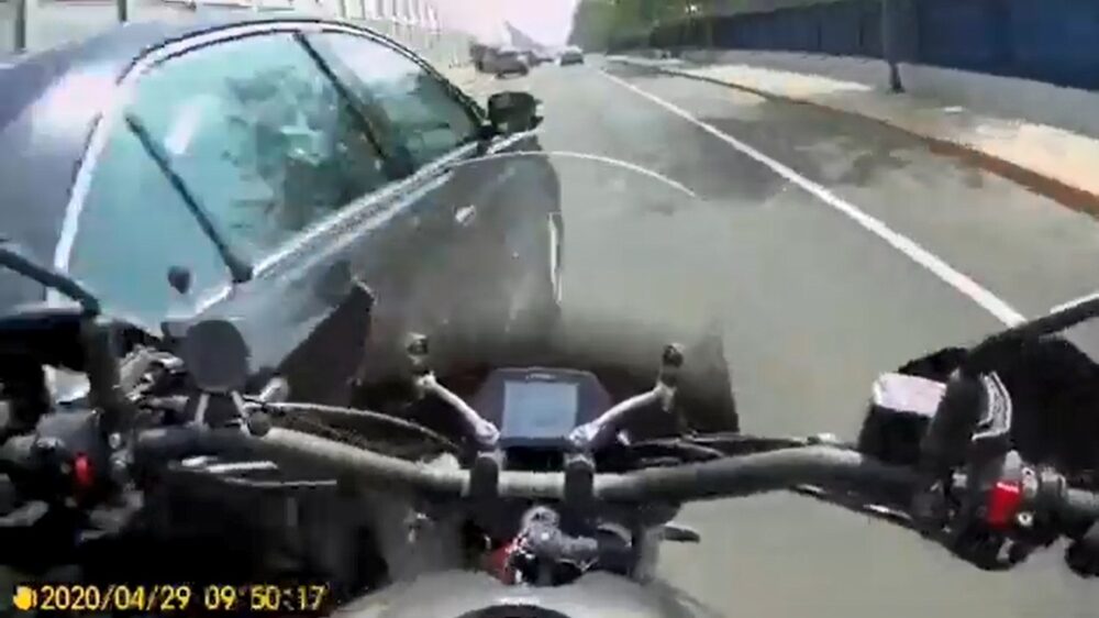Motorrijder breekt zijn enkel als automobilist hem afsnijdt tijdens verkeersfittie