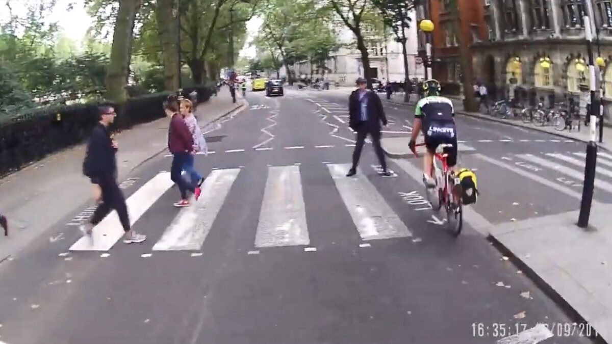 Voetganger zorgt ervoor dat deze wielrenner gewoon moet stoppen voor het zebrapad