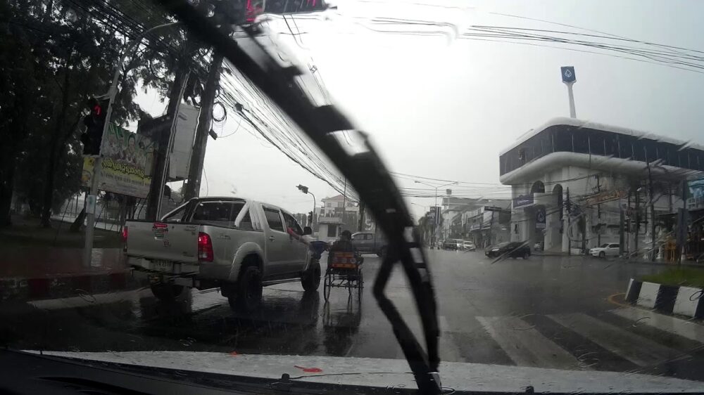 Barmhartige automobilist geeft paraplu aan zeiknatte gehandicapte bakfiets