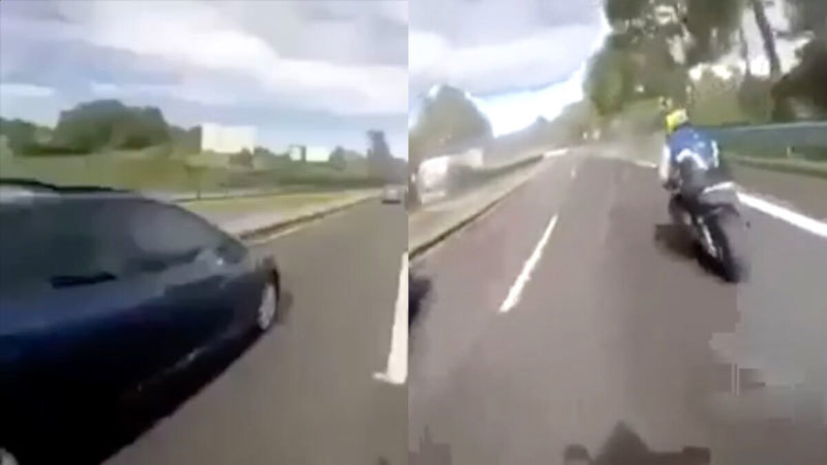 Tijd voor een heerlijke klapper uit de oude doos. Deze bestuurder wilde namelijk even een sprintje trekken tegen de naast hem rijdende motorrijders, maar daar was zijn vriendin niet zo'n voorstander van. Echter is het dan in volle vaart niet zo handig om aan de handrem van de auto van je vriend te trekken...