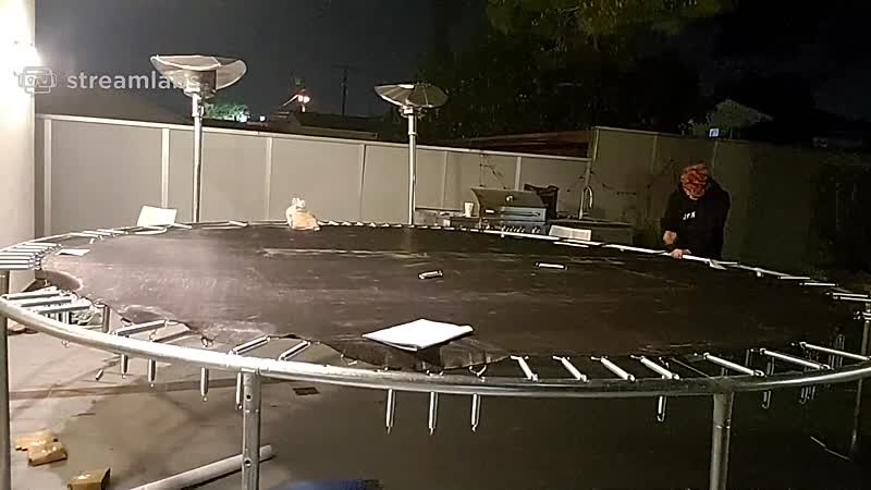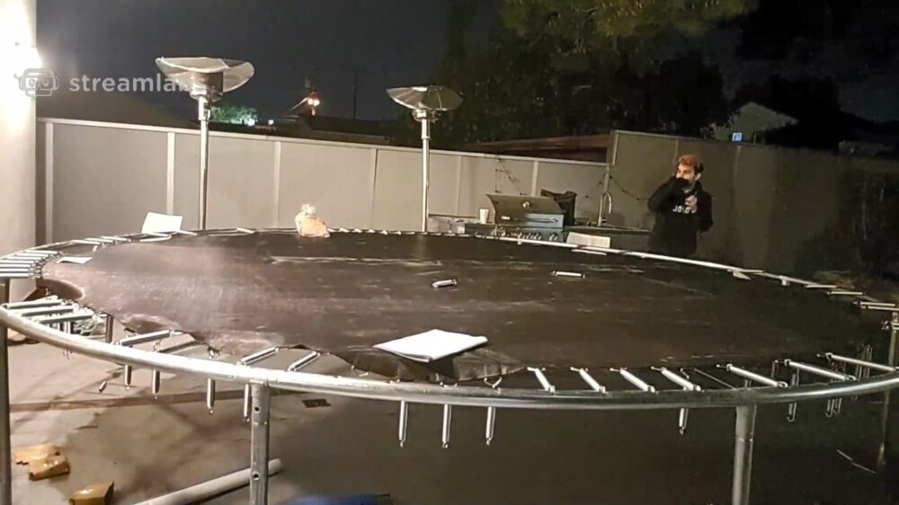 Met zo'n gruwelijk grote trampoline heb je ook een miljoenmiljard veren die aangespannen moeten worden. Als dat maar goed ga... Timmy!