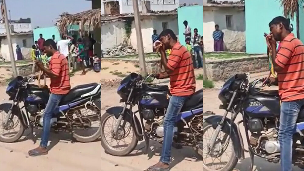 Dronken slangenmelker stopt even om een tussendoortje weg te werken