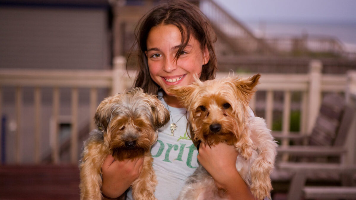 Meisje leert dat je goed moet opletten als je een hond knuffelt