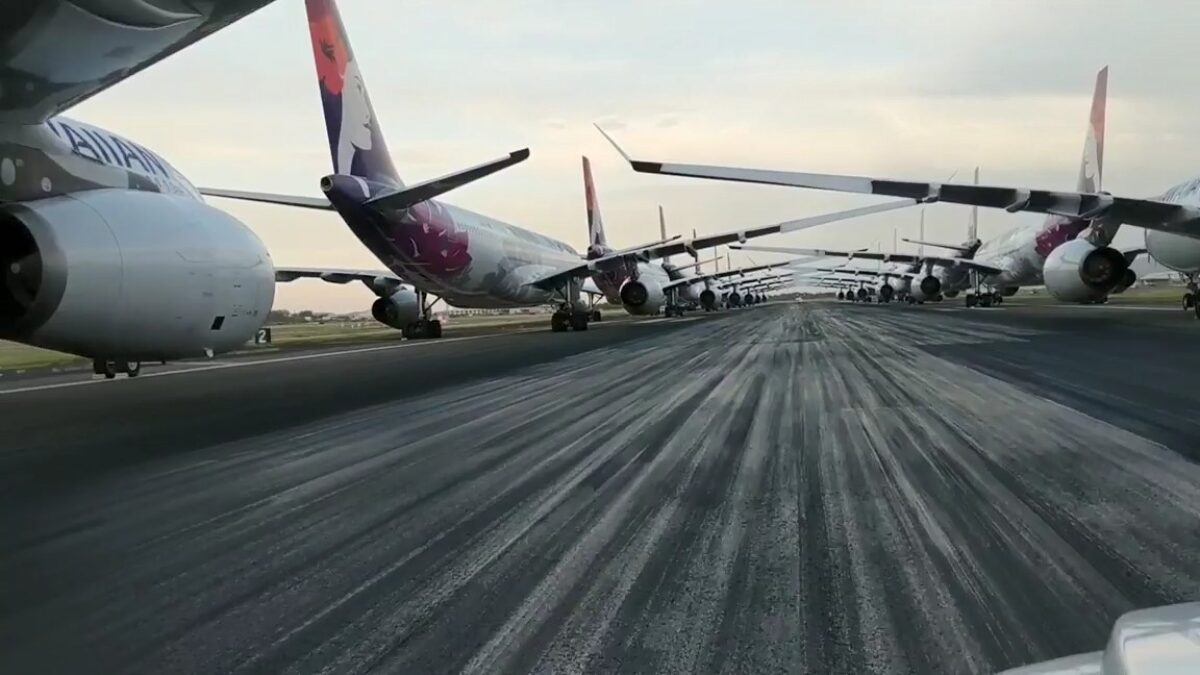 Vanwege het coronavirus kunnen een miljoenmiljard vliegtuigen niet de lucht in en worden ze op de landingsbanen van de overvolle vliegvelden gestald.