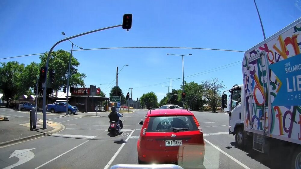 Motorrijder klapt vol tegen een auto aan als hij ongegeneerd door rood jankt