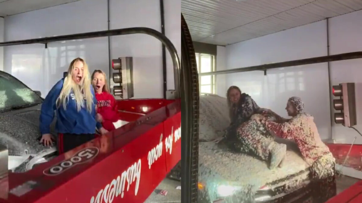 Als je een beetje vies bent geworden kun je natuurlijk onder de douche gaan staan en je kleding in de wasmachine gooien. Deze dames laten echter zien dat dat gemakkelijk in één keer kan: ga gewoon in de wasstraat staan! Oké, echt warm en comfortabel is het niet, maar je bent wel het snelst klaar.