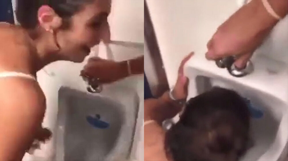 Dronken Debbie heeft ontzettende nadorst en drinkt water uit een urinoir