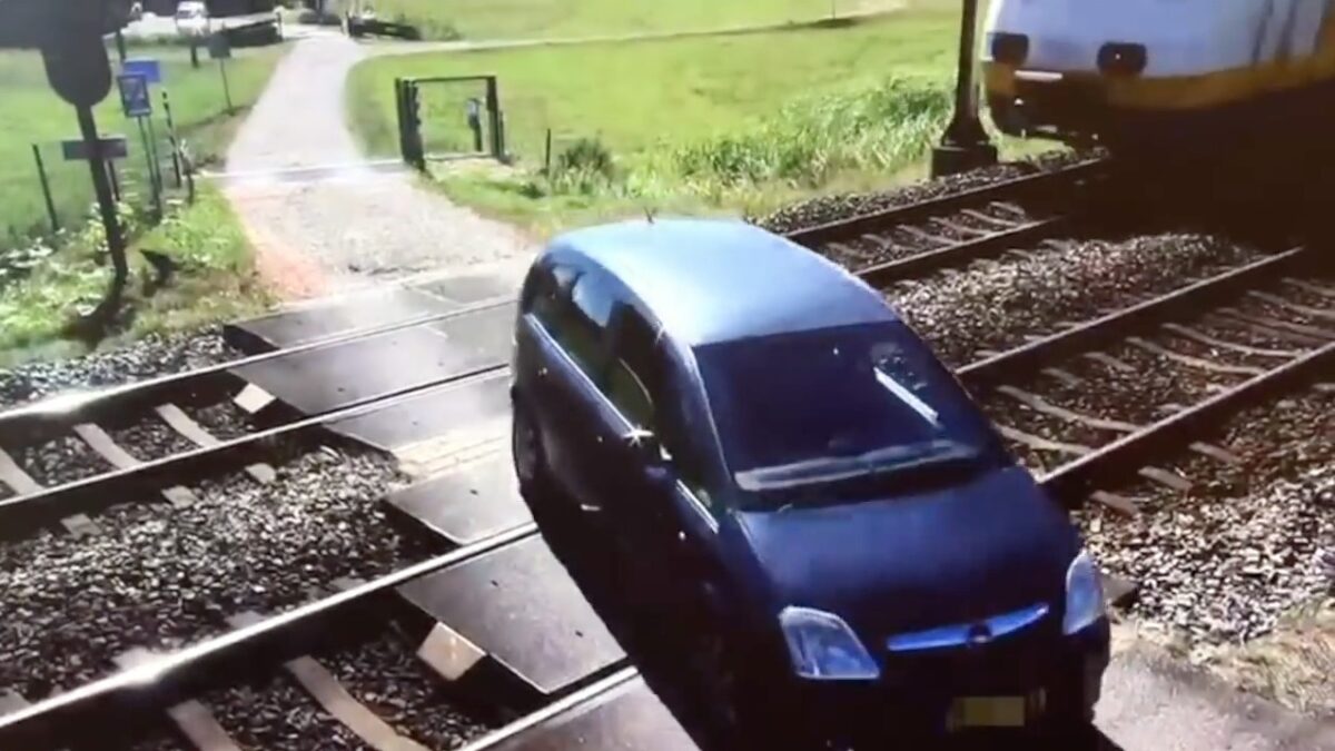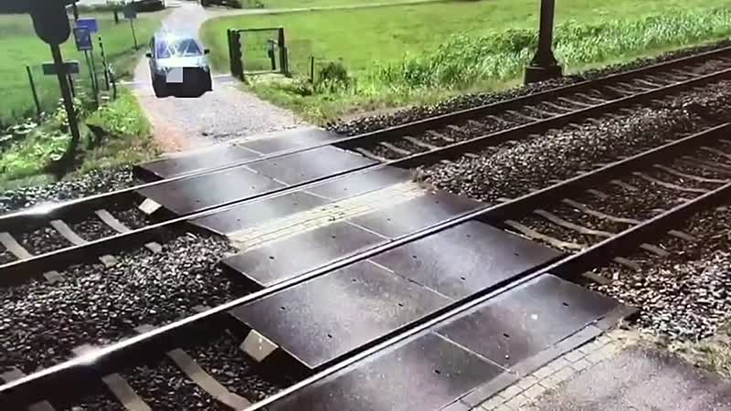 Op je dooie gemakje over een onbewaakte spoorwegovergang rijden had een stuk vervelender kunnen aflopen voor deze automobilist. En de machinist niet te vergeten...