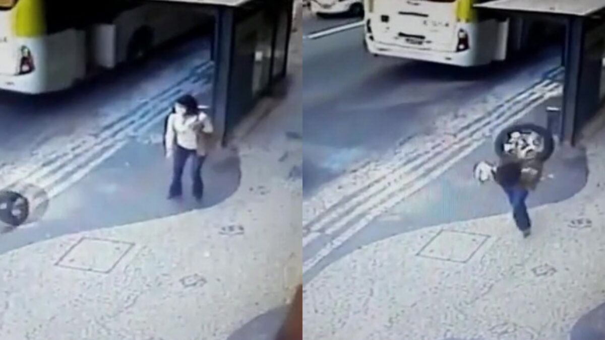 Deze nietsvermoedende dame was rustig aan de wandel toen ze nét een losgeslagen wiel kon ontwijken. Echter was deze ronde rakker niet voor één gat te vangen en besloot 'ie de dame alsnog van achter te verrassen.