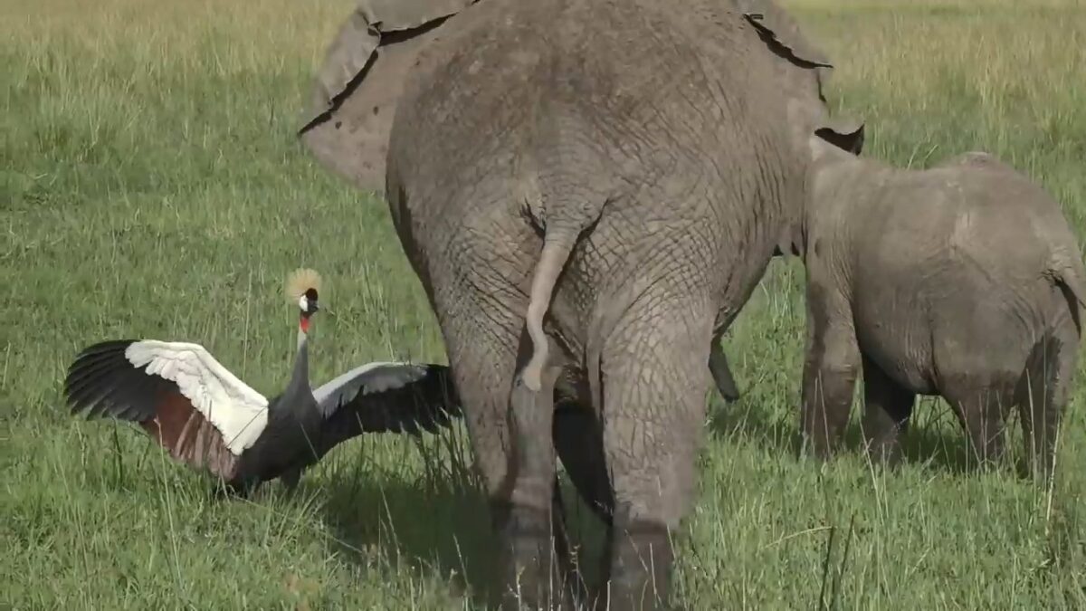 Dappere grijze kroonkraan beschermt haar nest en jaagt olifant weg