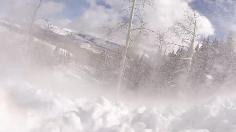 Benauwende POV van een skiër die door een lawine wordt overvallen