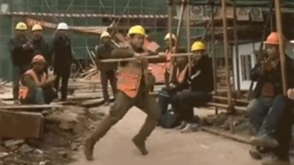 Bouwvakker grijpt pauze aan om zijn moves te showen Random