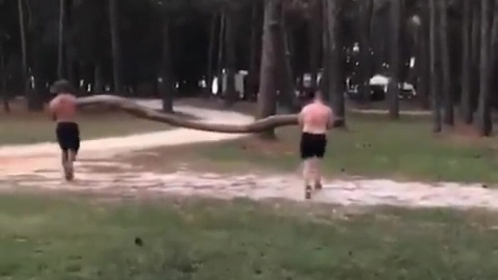 Twee stoere binken besluiten met een lange tak op een boom af te rennen