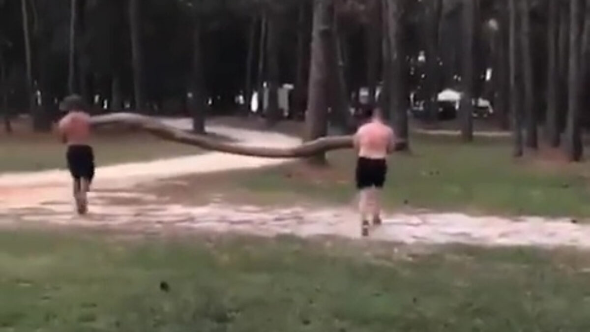Twee stoere binken besluiten met een lange tak op een boom af te rennen Fails
