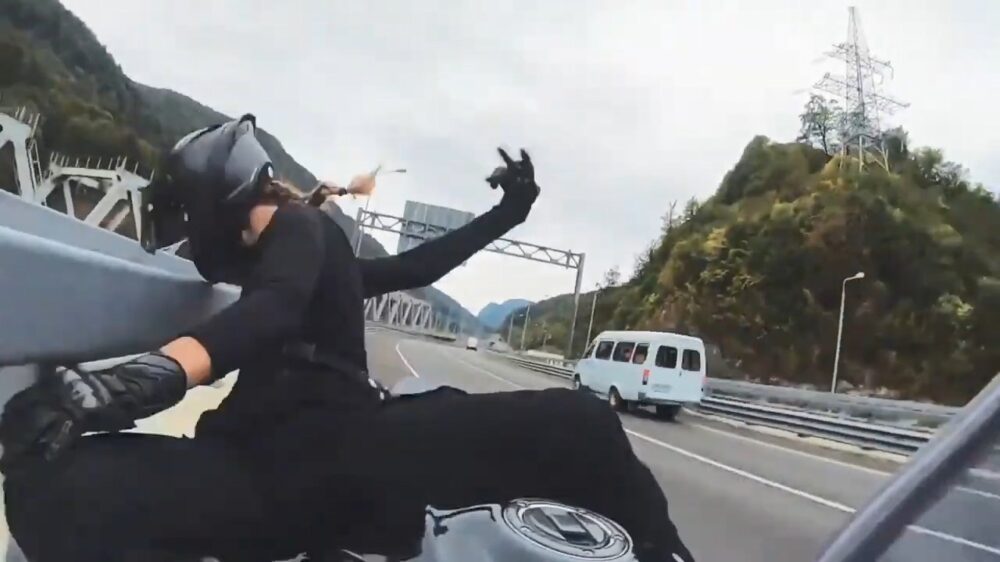 Deze vrouwelijke motorrijder verliest op hoge snelheid de controle en bewijst maar weer eens waarom je toch maar beter beschermde kleding kunt dragen tijdens het motorrijden. Gevalletje oude doos, maar nog steeds AUW.