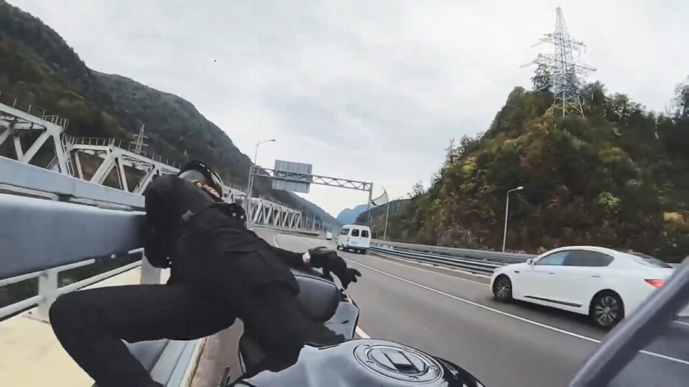 Vrouw maakt enorme klapper via de vangrail en zo van haar motor getrokken