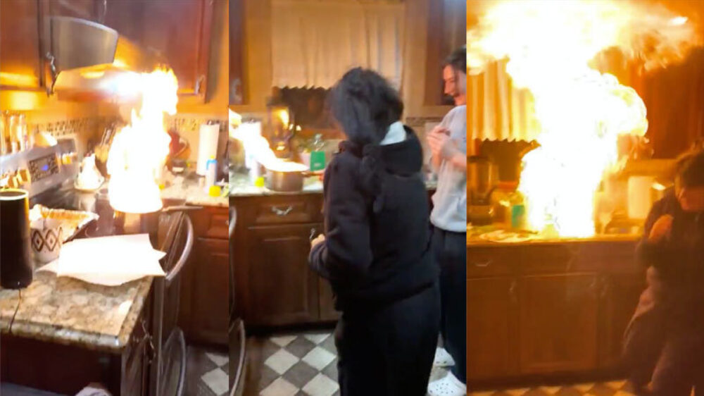 Geen idee wat ze hier precies aan het bereiden waren, maar het pannetje van het fornuis naar de gootsteen verplaatsen had niet echt het gewenste effect.
