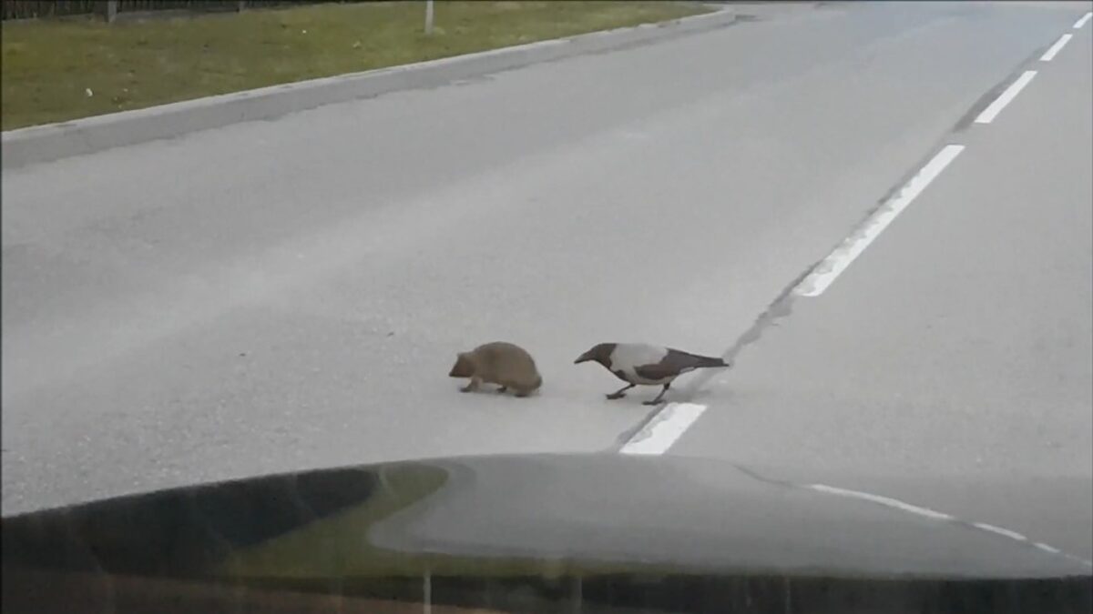 Kraai helpt zijn egelmattie om veilig de weg over te steken