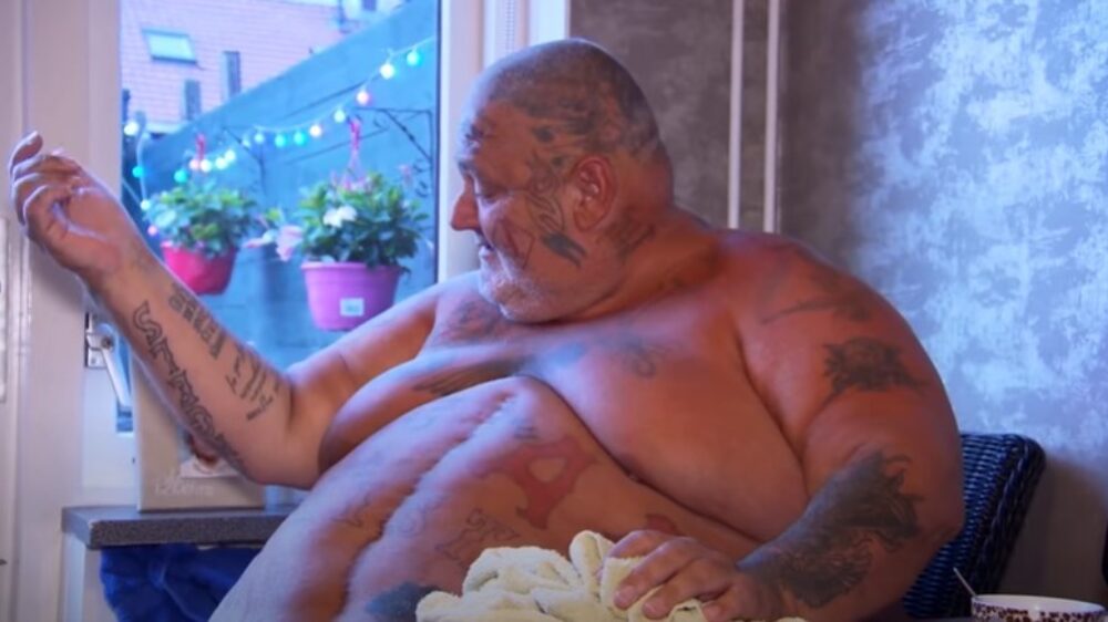 Het programma 'Man bijt hond XL' gaat vandaag gezellig op de koffie bij deze vriendelijke boeddha-liefhebber die een wild leven achter de rug heeft. Hij heeft in ieder geval genoeg ruimte om herinneringen te tatoeëren. ACAB in koeienletters valt haast bijna niet op.