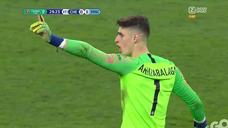 Lang verhaal kort: Chelsea-keeper Kepa heeft kramp, coach Sarri wil wisselen, maar Kepa besluit niet te gaan. Tot grote woede van Sarri uiteraard.