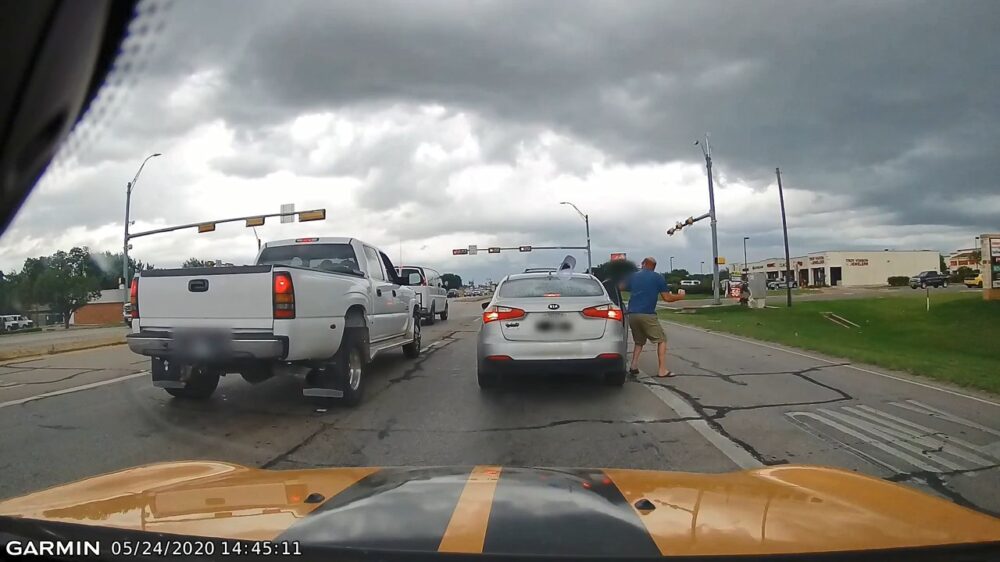 Driftkikker verliest al dan niet opzettelijk zijn koffie en pet tijdens road rage