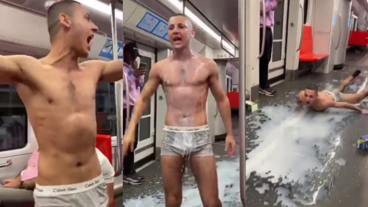 Fins gekkie overgiet zich met melk en maakt buikschuivers in het openbaar vervoer