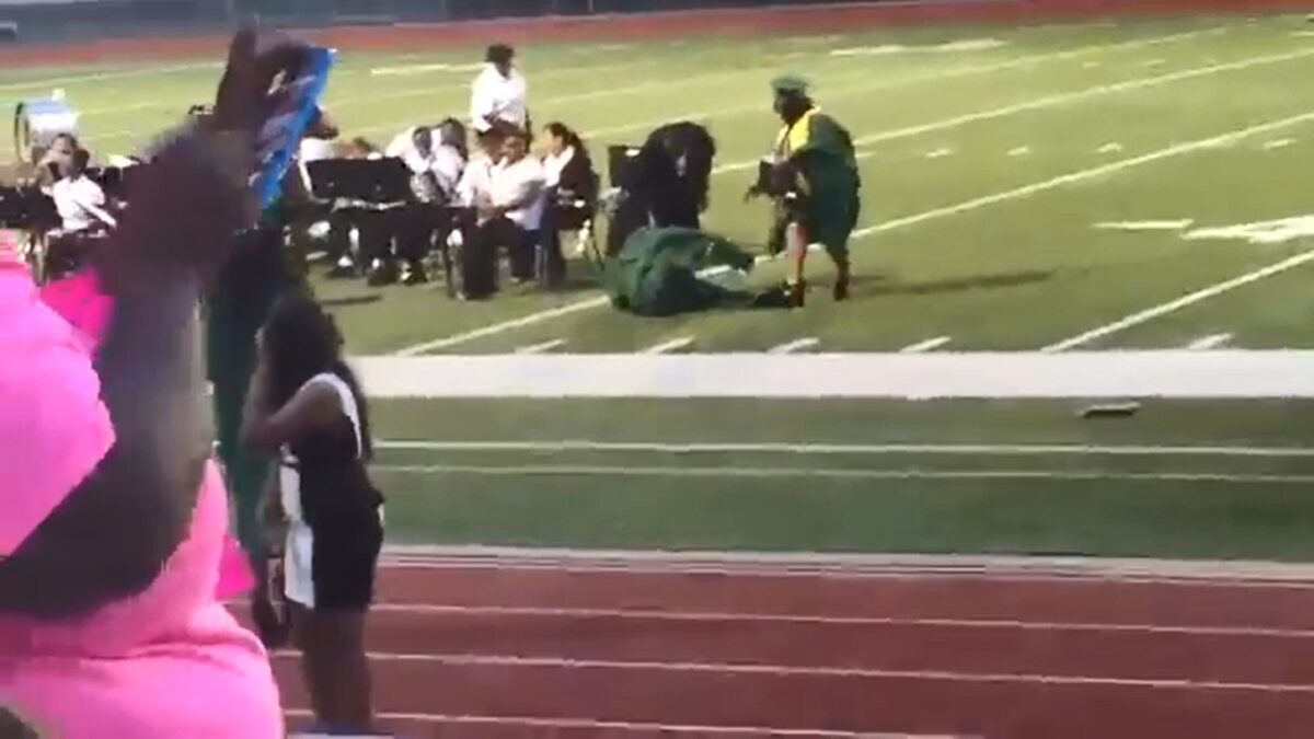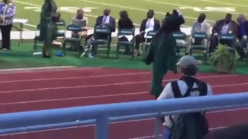 Dame heeft iets té hoge hakken aangetrokken tijdens haar diploma-uitreiking
