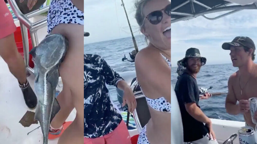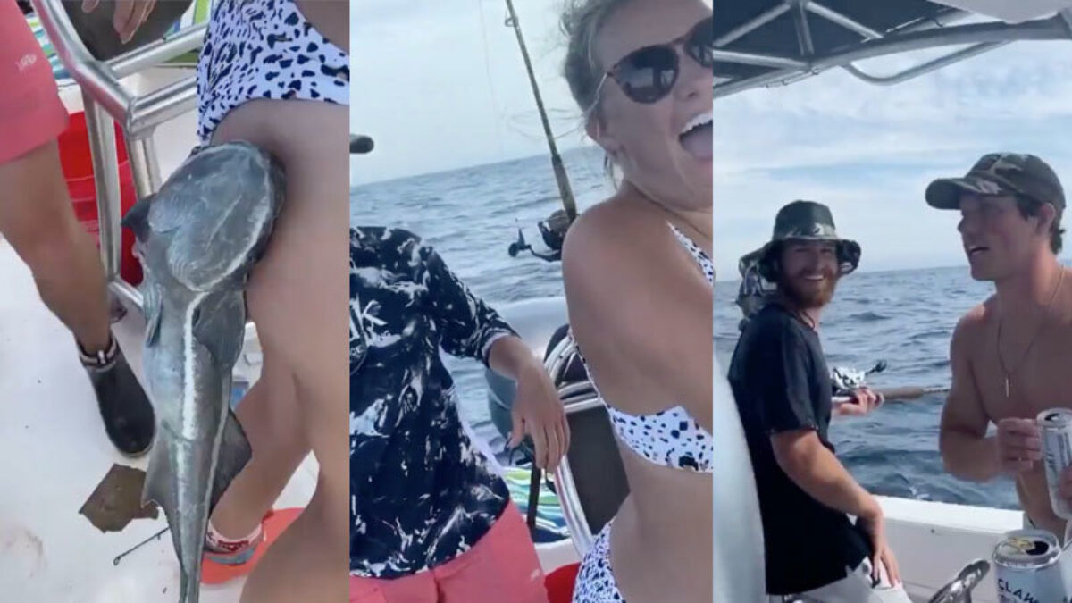 Blijkbaar had deze vis nog steeds niet genoeg gegeten en zette hij zijn tanden in de billen van deze professionele zeevisser.