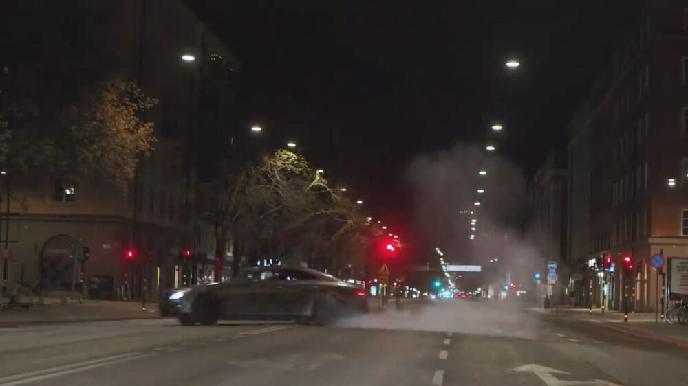 Amateurcoureur in Mercedes jankt op hoge snelheid door de straten van Stockholm