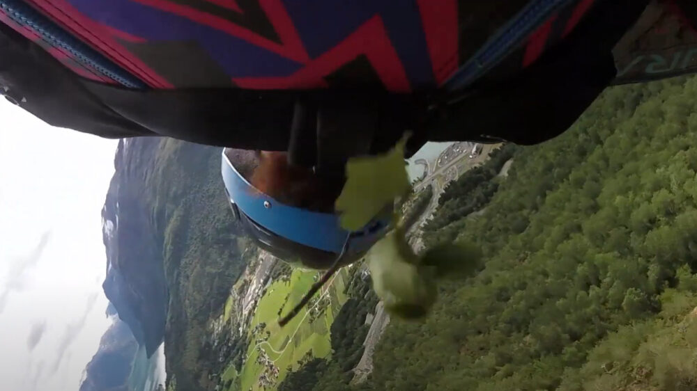 Wingsuiter besluit in volle vaart een takje mee te nemen