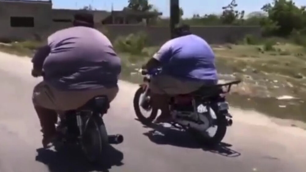 Twee stevige knapen gaan voor een ritje op de brommert