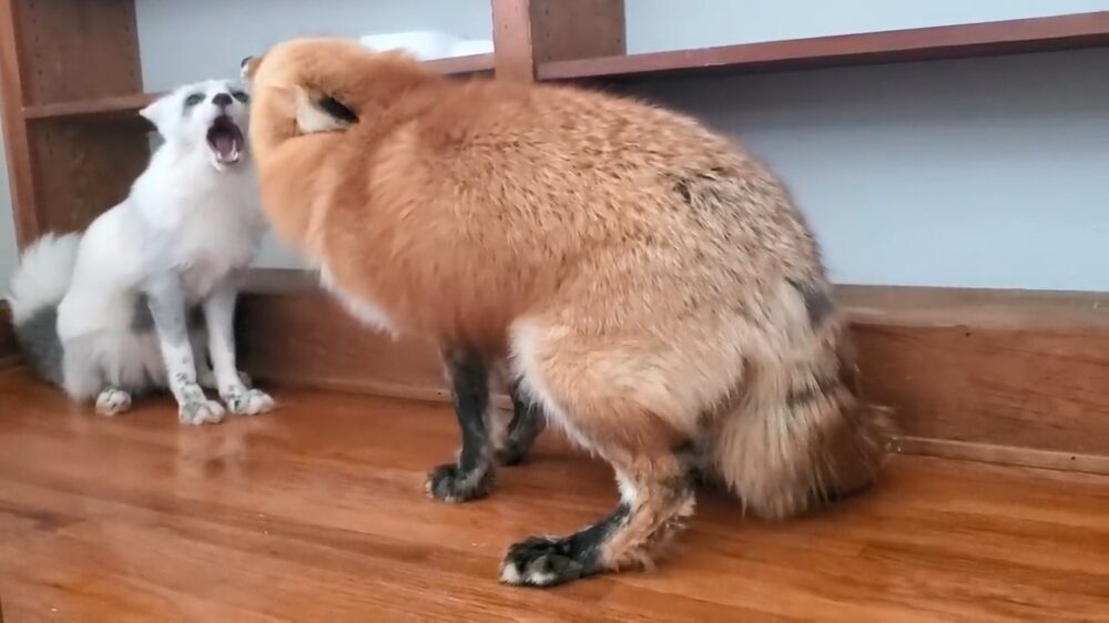 Vrouwtjesvossen hebben ruzie en schelden elkaar de vacht vol