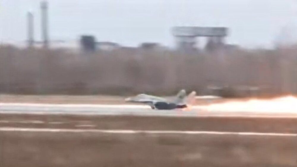 Straaljagerpiloot trekt zijn landingsgestel te vroeg in tijdens het opstijgen