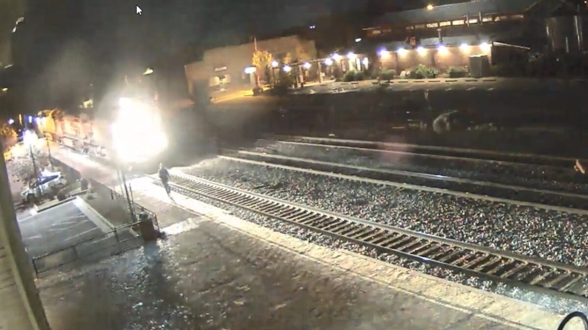 Je kunt de trein in het plaatsje Flagstaff al van mijlenver zien aankomen, maar het was nog niet duidelijk genoeg voor deze dronken voetganger. SPOILER ALERT: de trein wint uiteindelijk.
