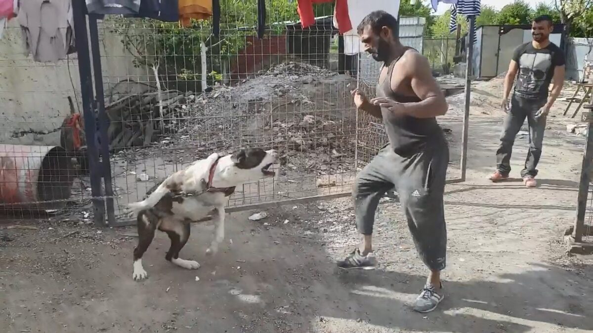 Lollige buurman daagt aangelijnde waakhond uit met de Macarena Dieren