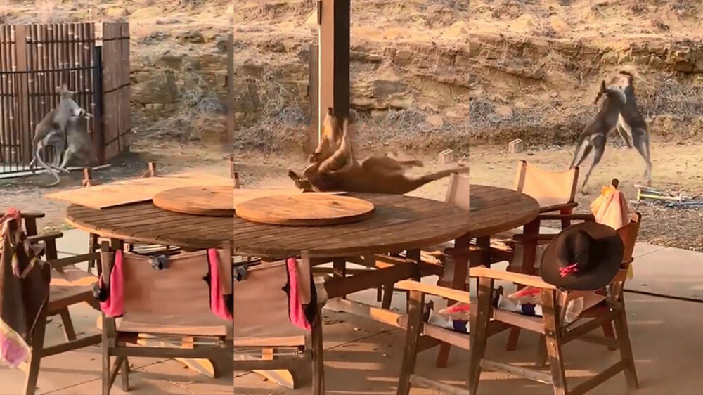 Wallabies rollen over tuinmeubels tijdens bruut gevecht in achtertuin