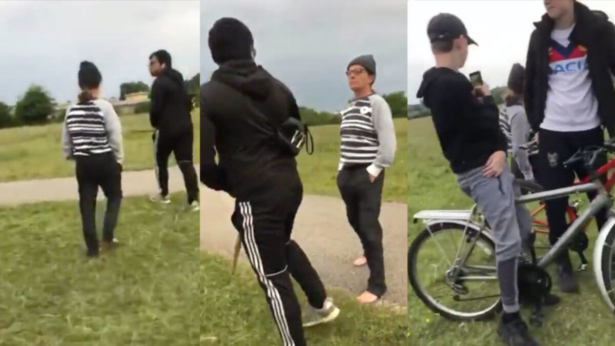 Engelse hondenhaatster valt jongen lastig die rustig zijn hond uitlaat