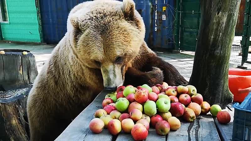 Enorme bruine beer geniet van een paar appels als ontbijt