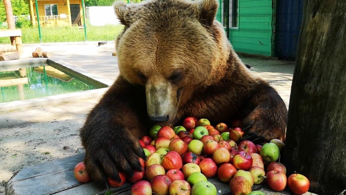 Enorme bruine beer geniet van een paar appels als ontbijt