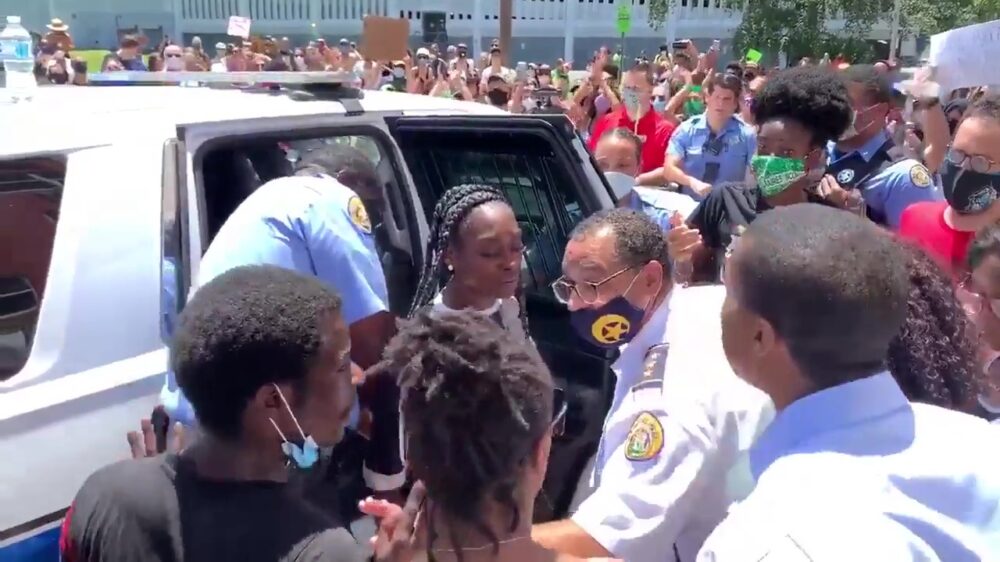 Op zijn minst bijzonder dat je direct na je aanhouding weer wordt vrijgelaten. Of zou het toch te maken hebben met de honderden BLM-demonstranten die de politieauto omsingelden?